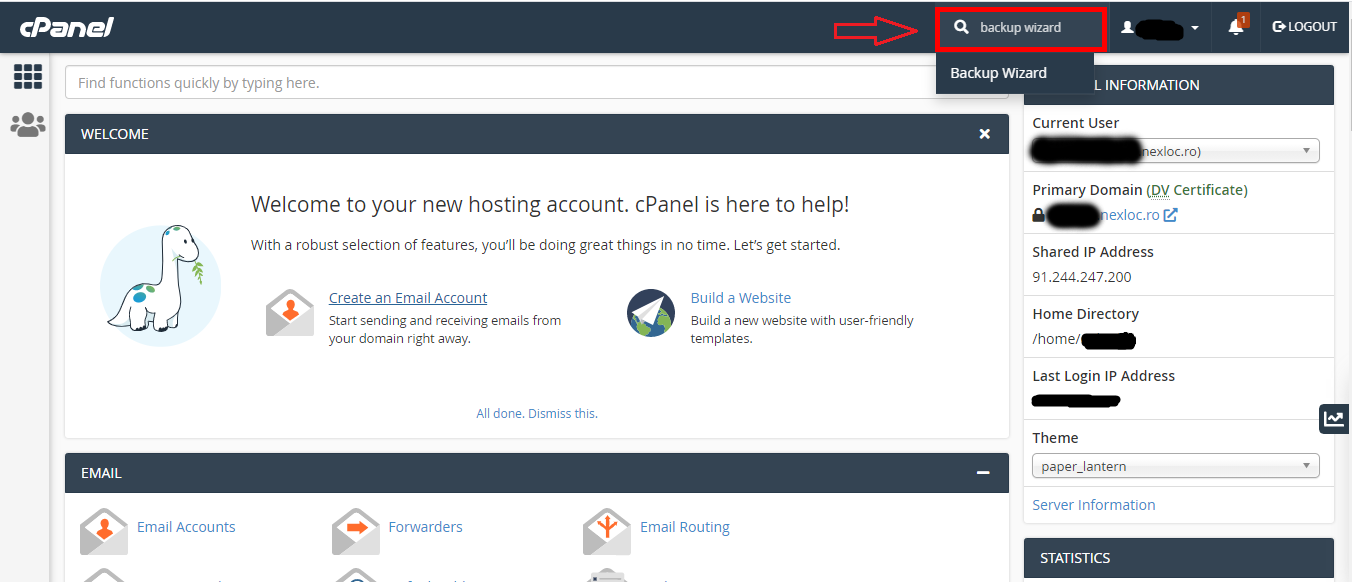 1. Va logati in contul cPanel si in bara de search tastati "Backup Wizard" sau "Expert copiere de rezerva"