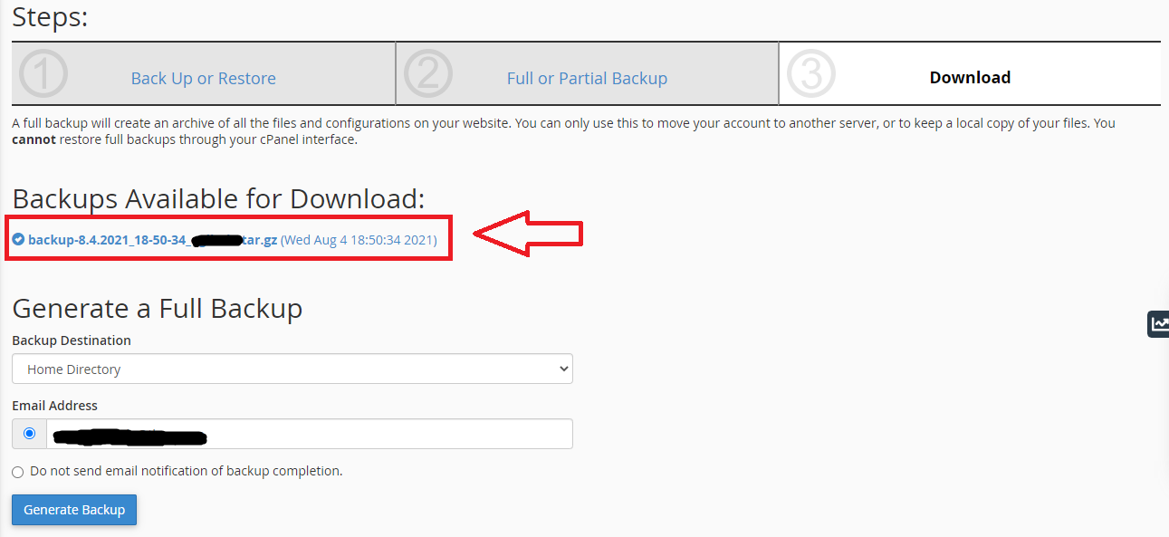 5.  La finalizarea backup-ului dati un refresh la pagina pentru a identifica si a descarca arhiva de backup generata.