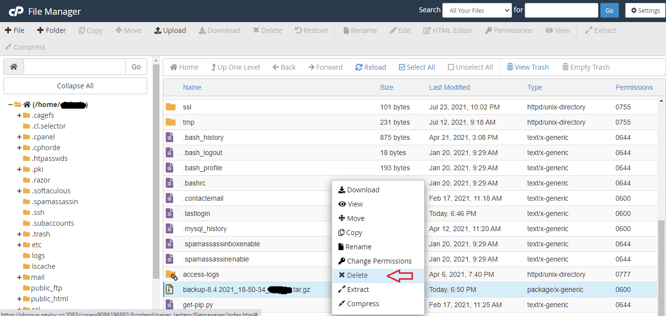 6. De asemenea puteti gasi arhiva de backup si in "File Manager" in afara folderului public_html (/home/usercpanel). Pentru a evita umplerea spatiului de disk din contul cPanel va recomandam ca sa stergeti arhiva de backup dupa ce ati descarcat-o. Nu uitati sa goliti si coșul, acesta fiind accesat de butonul "View Trash".